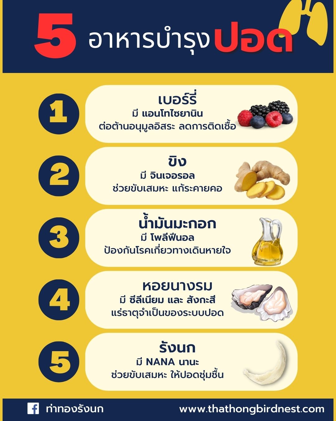 5. รังนก รังนกนางแอ่นที่ทำความสะอาดแล้วปรุงสุกพอดี อุดมไปด้วยสารไกลโครโปรตีน หรือ NANA นานะ ช่วยเรื่องระบบภูมิคุ้มกันร่างกาย ขับเซลล์ผิวให้ผิวกระจ่างใส และยังช่วยขับเสมหะ เพิ่มความชุ่มชื่นให้ปอด ทำให้ร่างกายฟื้นตัวได้เร็วอีกดวย
